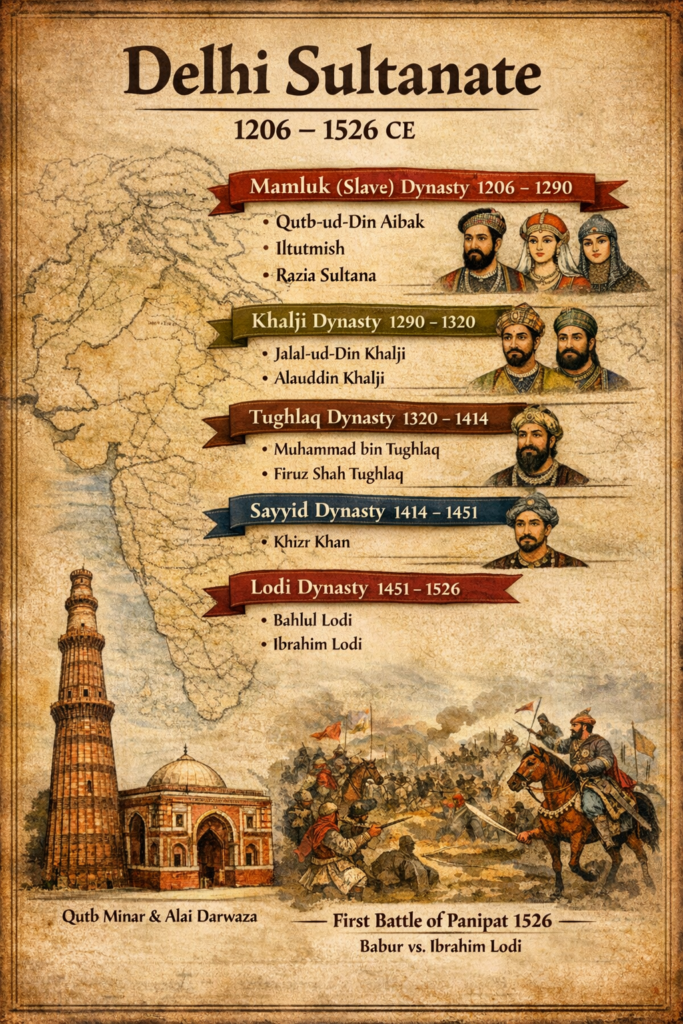 Delhi Sultanate हा मध्ययुगीन भारताचा एक अत्यंत महत्त्वाचा काळ होता. 1206 ते 1526 CE या काळात दिल्ली आणि त्याच्या आजूबाजूच्या प्रदेशांवर अनेक मुसलमान राजवंशांनी राज्य केले. या काळात राजकारण, समाज, अर्थव्यवस्था आणि संस्कृती या सर्व क्षेत्रात मोठे बदल घडले.