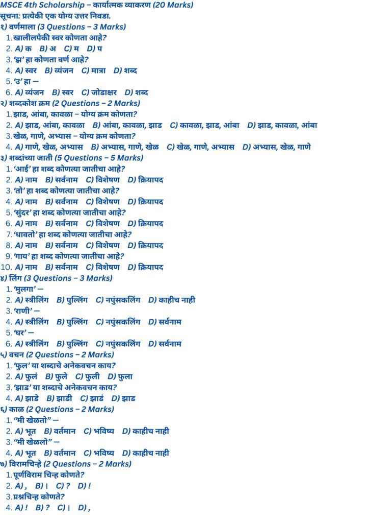 MSCE 4th Scholarship परीक्षा साठी कार्यात्मक व्याकरणाचा (Functional Grammar)संपूर्ण मार्गदर्शक. वर्णमाला, शब्दकोश क्रम, शब्दांच्या जाती, लिंग, वचन, काळ, विरामचिन्हे, शुद्ध–अशुद्ध शब्द, प्रत्यय आणि उपसर्ग यासह उदाहरणे आणि MCQs दिले आहेत. अभ्यास करा, सराव करा, आणि परीक्षा जिंका!
