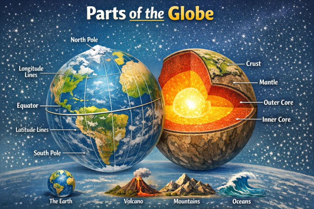• ग्लोब हा पृथ्वीचा खरा नमुना आहे (विकृती कमी) • पृथ्वीचा अक्ष 23½° झुकलेला असतो • विषुववृत्त = 0° अक्षांश • प्रधान रेखांश = 0° रेखांश (ग्रीनविच) • दिवस–रात्र, ऋतू, वेळ विभाग समजावण्यासाठी उपयोगी