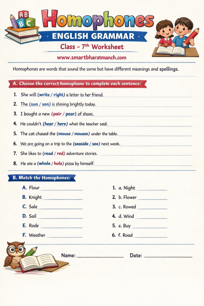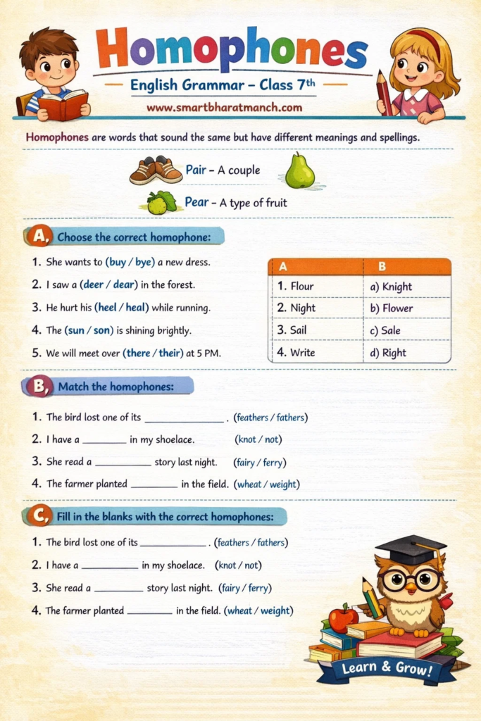 Homophones हा इंग्रजी व्याकरणातील अत्यंत महत्त्वाचा भाग आहे. शिष्यवृत्ती परीक्षा, स्पर्धा परीक्षा आणि शालेय परीक्षांमध्ये यावर आधारित प्रश्न नेहमी विचारले जातात. त्यामुळे विद्यार्थ्यांनी हा topic नीट समजून घेणे आवश्यक आहे.