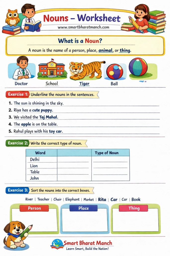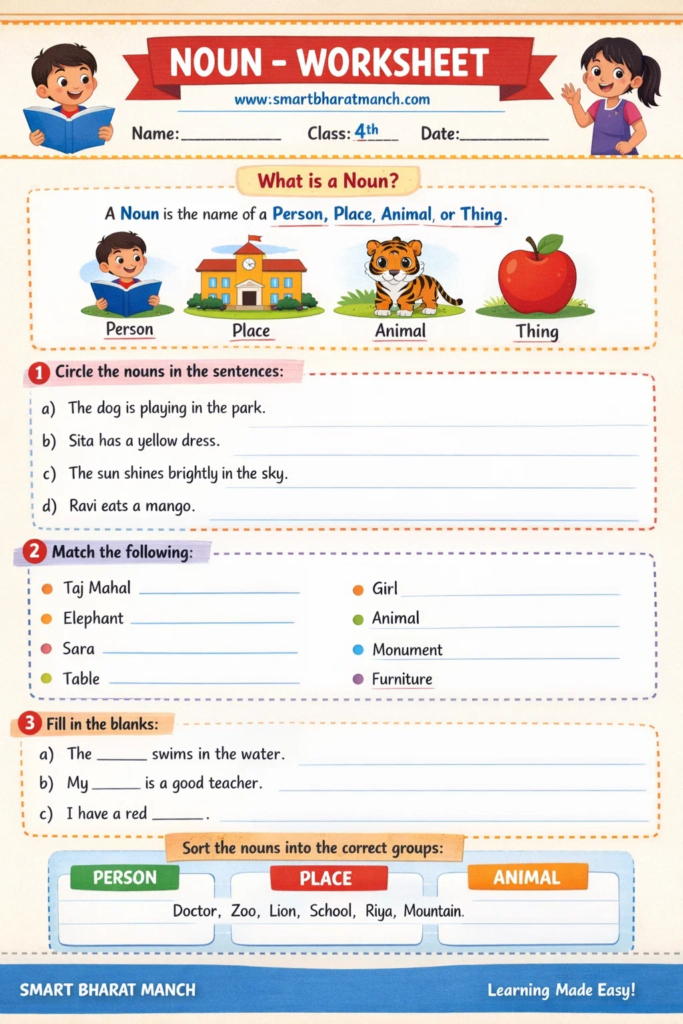 Noun हा इंग्रजी व्याकरणाचा पाया आहे. वाक्य तयार करताना सर्वात आधी noun लागतो. शिष्यवृत्ती परीक्षेत grammar मधील 4–6 गुण Noun वर आधारित असतात.