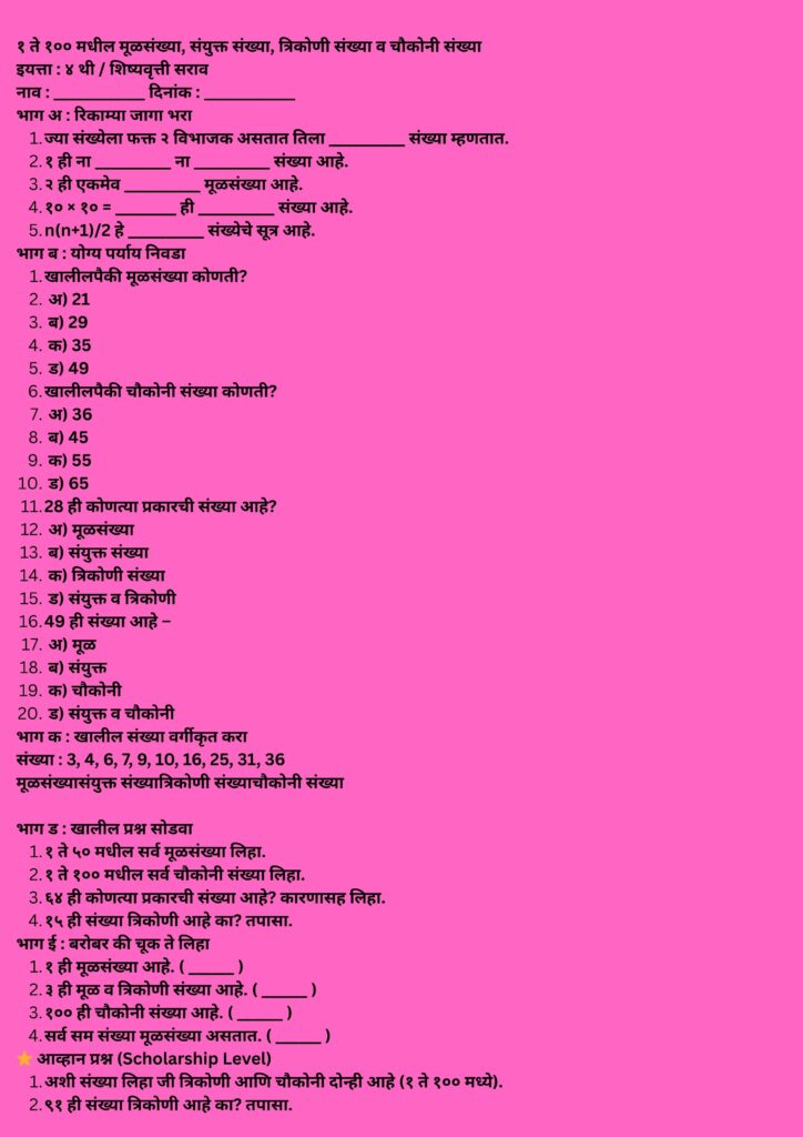 गणित हा विषय विद्यार्थ्यांच्या बौद्धिक विकासासाठी अत्यंत महत्त्वाचा आहे. इयत्ता 4थी व शिष्यवृत्ती परीक्षेच्या दृष्टीने संख्याज्ञान (Number Sense) हा पाया मजबूत असणे गरजेचे आहे.Number Sense 1 to 100 या संख्यांमधील मूळसंख्या (Prime Numbers), संयुक्त संख्या (Composite Numbers), त्रिकोणी संख्या (Triangular Numbers) आणि चौकोनी संख्या (Square Numbers) यांचे सखोल ज्ञान असल्यास विद्यार्थी गणितातील अनेक उदाहरणे सहज सोडवू शकतात.