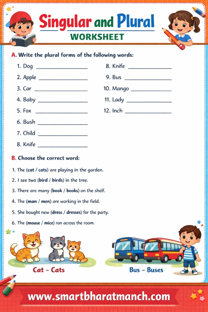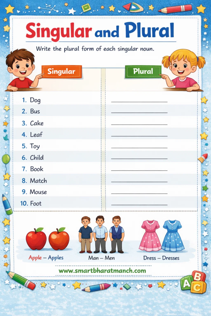 Singular and Plural हा इंग्रजी व्याकरणातील अत्यंत महत्त्वाचा विषय आहे. Singular म्हणजे एक वस्तू किंवा व्यक्ती आणि plural म्हणजे अनेक वस्तू किंवा व्यक्ती. Plural बनवण्यासाठी s, es, ies, ves असे नियम वापरले जातात. काही शब्दांचे plural वेगळे असते जसे man–men, child–children. या नियमांचा नियमित सराव केल्यास विद्यार्थ्यांना शिष्यवृत्ती परीक्षेत नक्कीच चांगले गुण मिळू शकतात.