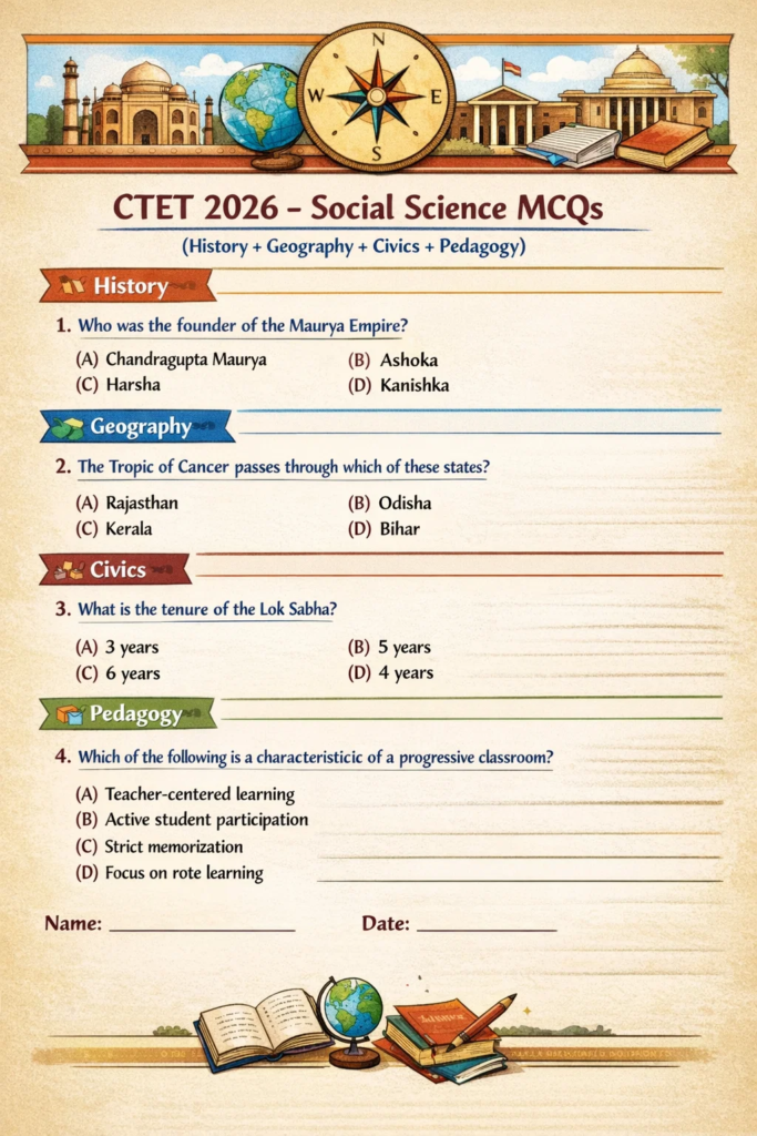 CTET 2026 Paper 2 मध्ये Social Science हा अत्यंत महत्त्वाचा विषय आहे. यात इतिहास, भूगोल, नागरिकशास्त्र आणि Social Science Pedagogy या घटकांचा समावेश असतो. शिक्षक होऊ इच्छिणाऱ्या उमेदवारांसाठी विषयाची सखोल समज आणि MCQ सराव अत्यावश्यक आहे.