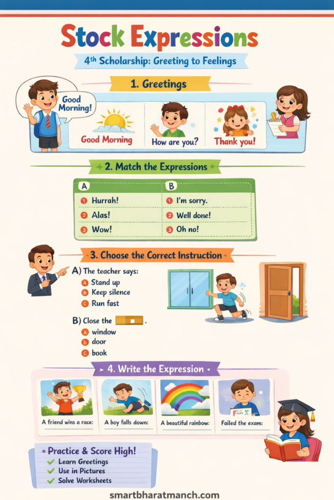 इयत्ता ४ थी शिष्यवृत्ती परीक्षेमध्ये इंग्रजी विषयातील “Stock Expressions” हा खूप महत्त्वाचा भाग असतो. अनेक वेळा विद्यार्थ्यांना शब्दांचा अर्थ माहीत असतो; पण योग्य ठिकाणी योग्य वाक्य वापरता येत नाही. म्हणूनच “Stock Expressions” म्हणजे तयार स्वरूपातील वाक्यप्रयोग शिकणे आवश्यक आहे.