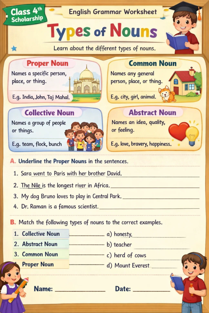 इंग्रजी विषयात Types Of Nouns हा अत्यंत महत्त्वाचा व्याकरणाचा भाग आहे. शिष्यवृत्ती परीक्षेत नाम ओळखणे, त्याचा प्रकार सांगणे आणि वाक्यात योग्य वापर करणे यावर प्रश्न विचारले जातात. खाली Noun चे सविस्तर स्पष्टीकरण मराठीत दिले आहे.