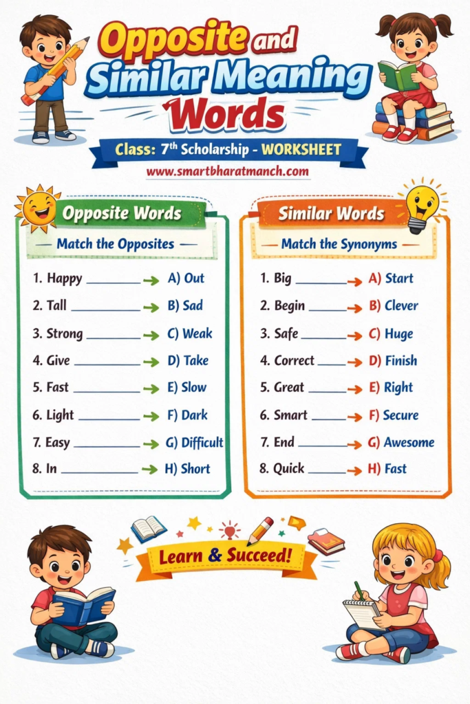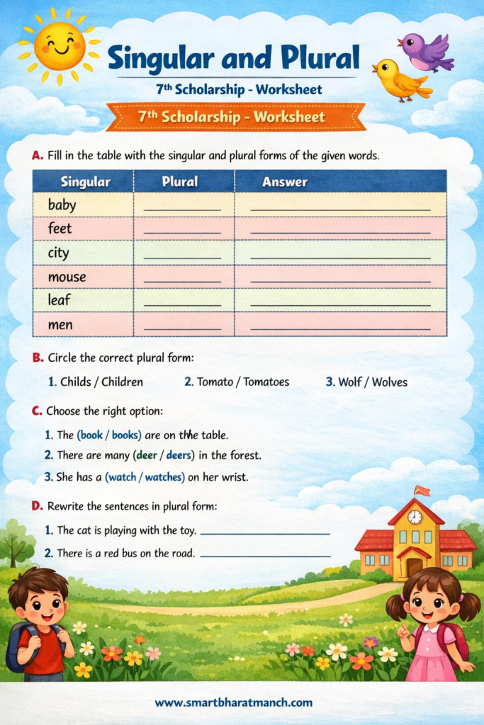 इयत्ता ७ वी शिष्यवृत्ती परीक्षेमध्ये इंग्रजी विषयात अनेक प्रश्न Singular–Plural, Opposite Words (Antonyms) आणि Similar Meaning Words (Synonyms) यावर आधारित असतात. त्यामुळे विद्यार्थ्यांनी या घटकांचा चांगला अभ्यास करणे आवश्यक आहे.
