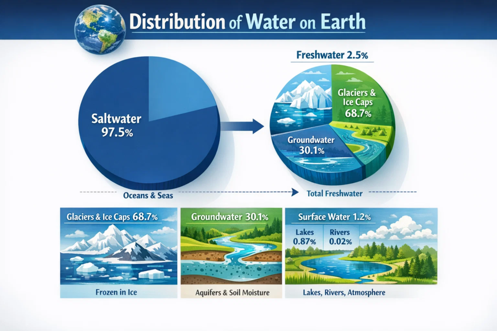 - Salt Water (खारट पाणी) – सुमारे 97%